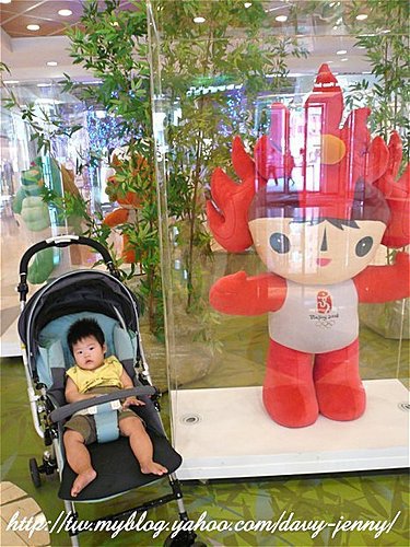 Davy&Jenny又推著晴兒的愛車出發了,目的地就是京華城~在大門口看到奧運福娃,讓晴兒照一張~只是這胖娃兒根本搞不清楚狀況,一臉恍神.......沒辦法!!因為我們這對父母為了想逛街叫醒沉睡的她~可能還在半夢中吧~